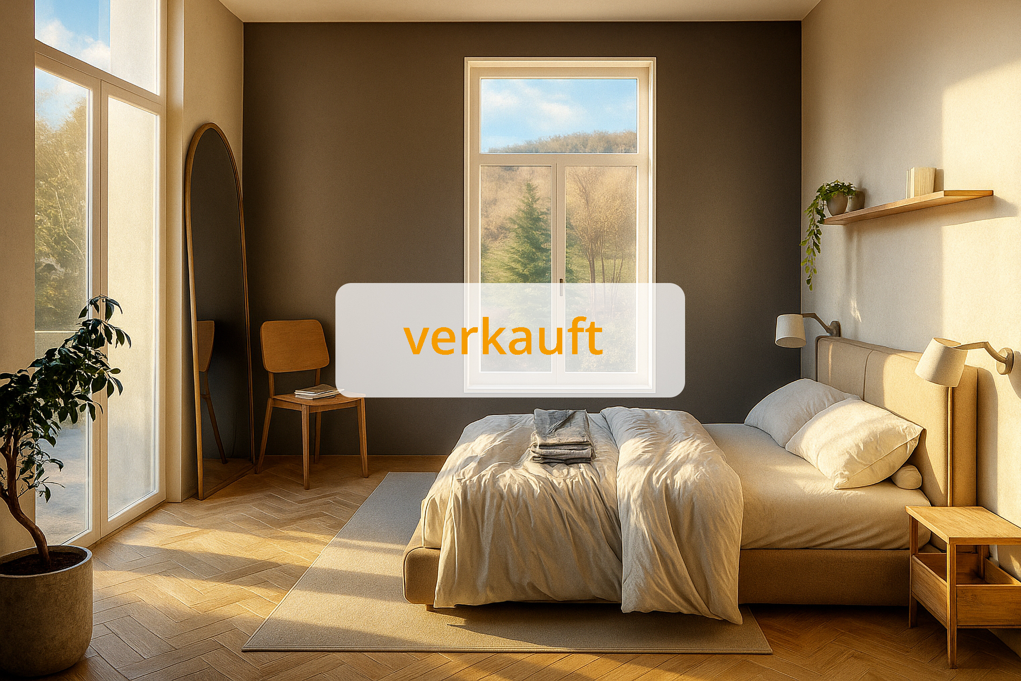 Das helle Schlafzimmer bietet Zugang zum großzügigen Balkon, welcher in Nord-Ost-Ausrichtung der Wohnung vorgelagert ist. Angrenzend an das Schlafzimmer befindet sich das hochwertige Badezimmer, welches mit einem WC, einem Waschtisch und einer bodeneben gefliesten Dusche ausgestattet und mit großformatigen Fliesen versehen ist. Der offen gestaltete Wohn-/Ess-/Kochbereich ist durch die beiden bodentiefen Fenster hell und einladend auf einer Fläche von ca. 32m² gestaltet.