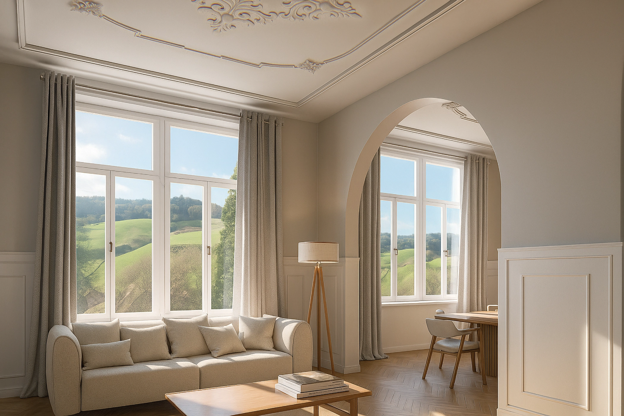 Im zweiten Obergeschoss befindet sich das Stuckkabinett in Form einer 4-Zimmer-Wohnung. Die Ornamente an den Decken erzählen eine Geschichte vergangener Pracht, jedes Detail ist wie ein kleines Gemälde.