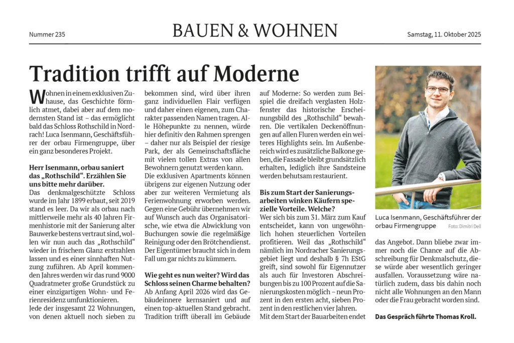 11.10.2025 | Im Interview erklärt Luca Isenmann, Geschäftsführer der orbau Firmengruppe, wie das denkmalgeschützte Schloss Rothschild in Nordrach zu exklusiven Wohn- und Ferienapartments umgebaut wird.